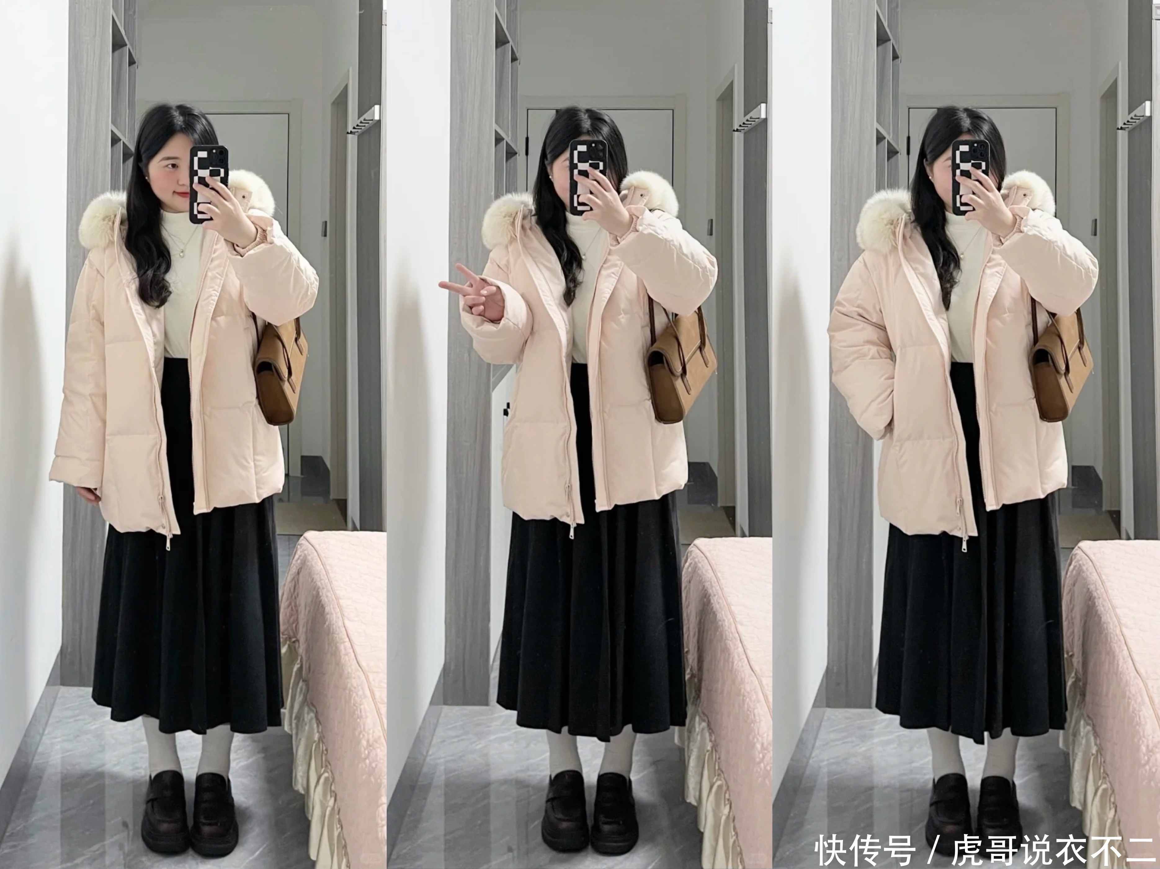 搭配短外衣亦是如斯,淡粉色羽绒服内搭修身的米白色高领打底衫,下半身搭配玄色高腰百褶裙,合座穿搭温存有度,遮肉显瘦的同期还能彰显冬季穿搭的和缓氛围感,既保证了温度,又不失机髦。