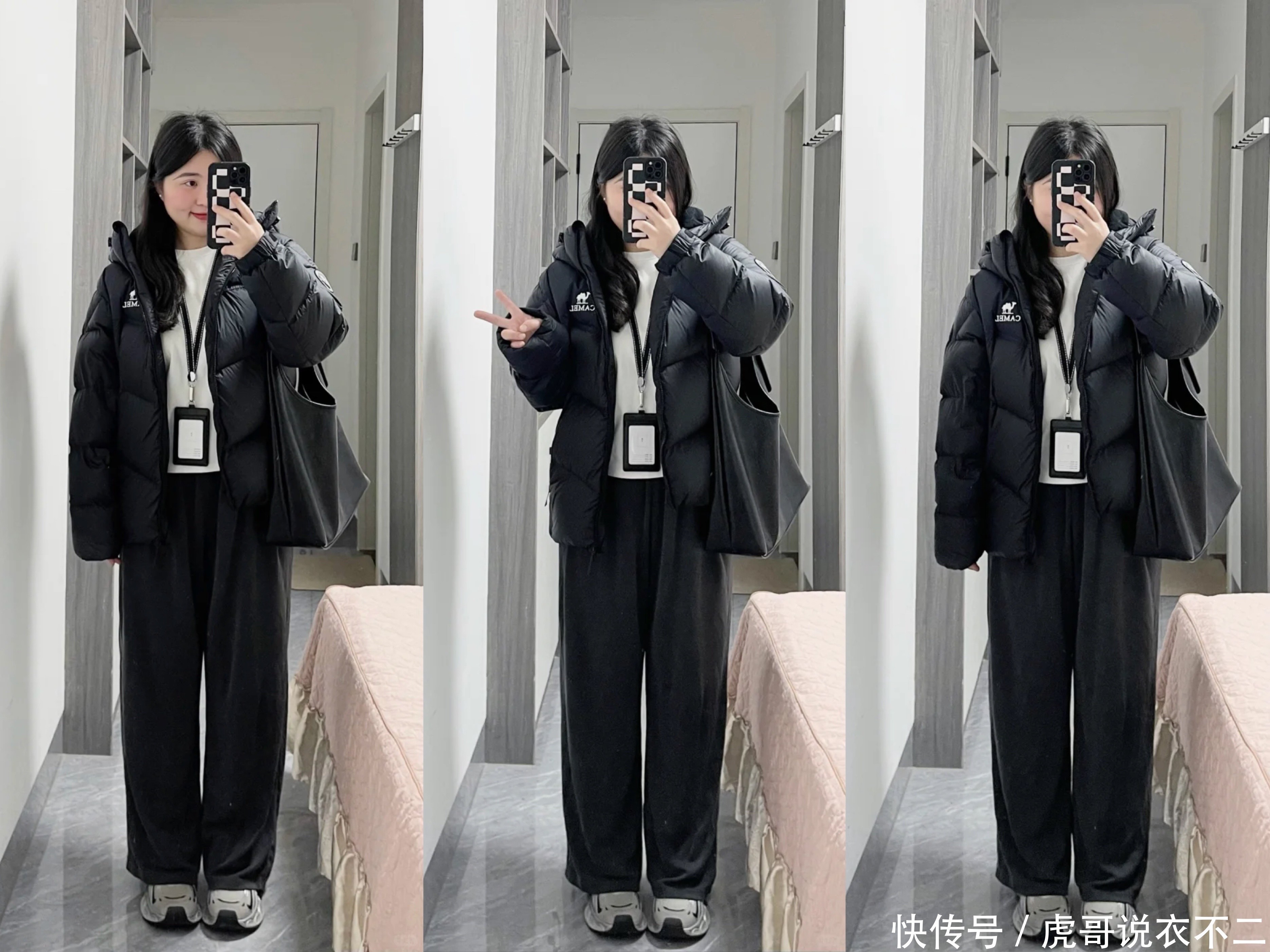 纯玄色穿搭亦然微胖肉体必选的搭配,玄色短款羽绒服搭配玄色窄版阔腿裤,内搭白色打底,极端浅陋的黑白色穿搭,玄色在自己在视觉上就有一定的收缩成果,而窄版阔腿裤同期又很遮肉,有了白色内搭的烘托,合座穿搭又不会显得千里闷。