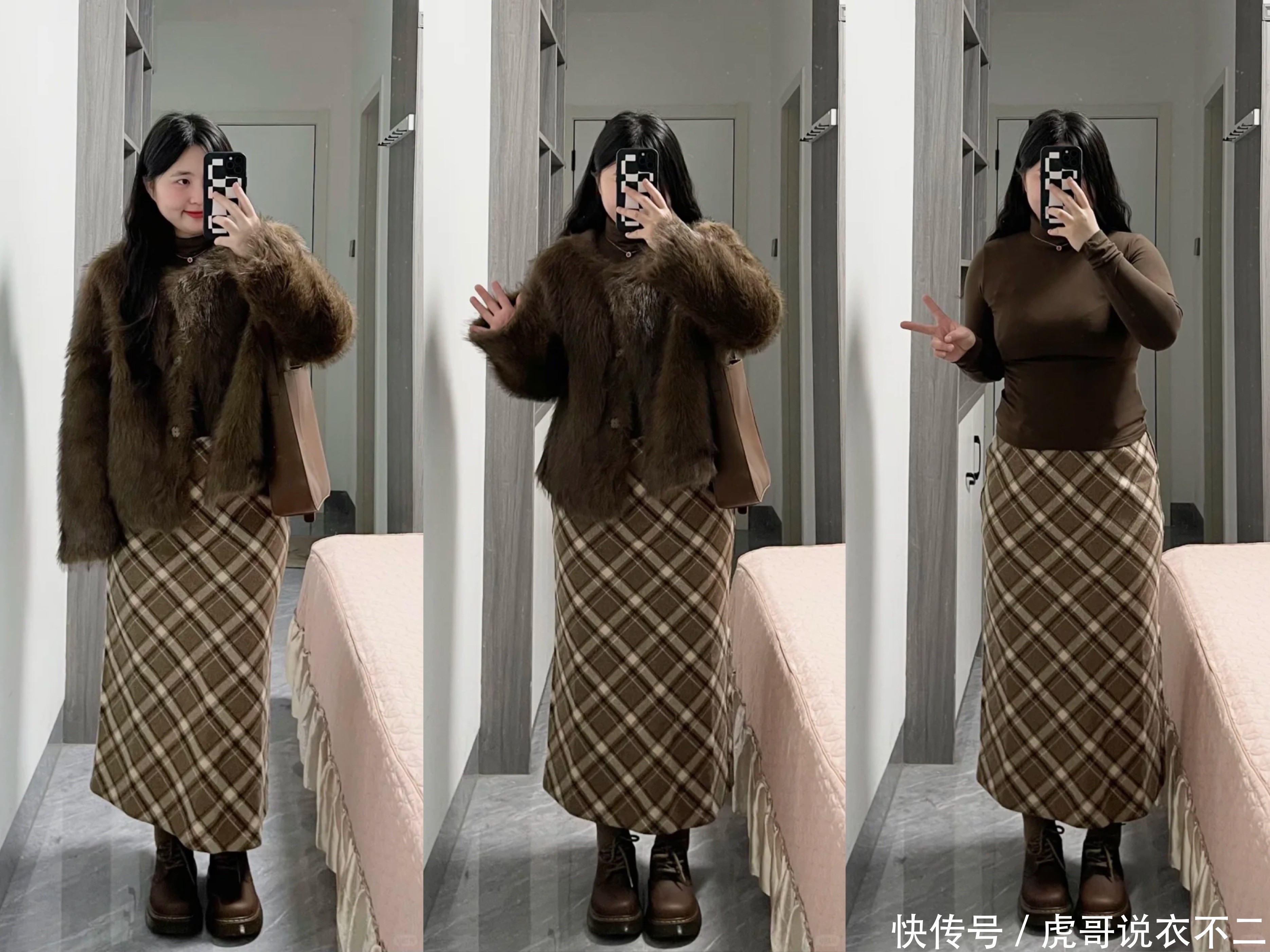 毛呢短外衣搭配格纹包臀裙,直筒的版型,加上格纹元素,有一定的收缩下半身成果,然则相似也需要高腰线来加持,视觉上造成上宽下窄的成果,极端显瘦,对微胖肉体杰出又好。