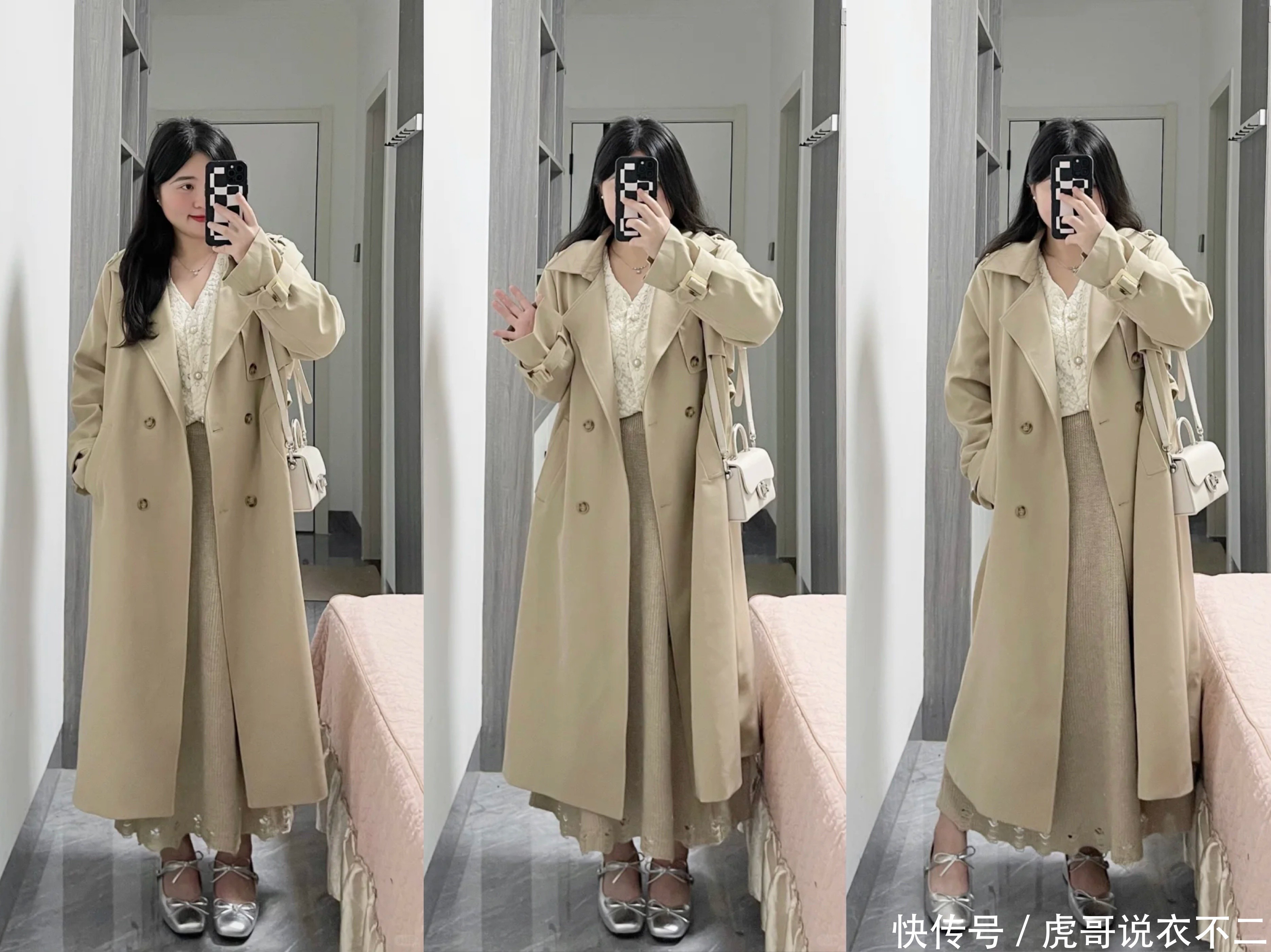 好多东说念主对微胖穿搭有个误区,觉得胖就要穿紧身,其实否则,允洽的宽松版型,遮肉显瘦的成果更好,然则切忌太过宽松的大廓形单品,恰到平允即可,比如卡其色长款大衣内搭米白色衬衫+卡其色高腰半身裙伞裙,凸起高腰线,又有很好的遮肉成果。