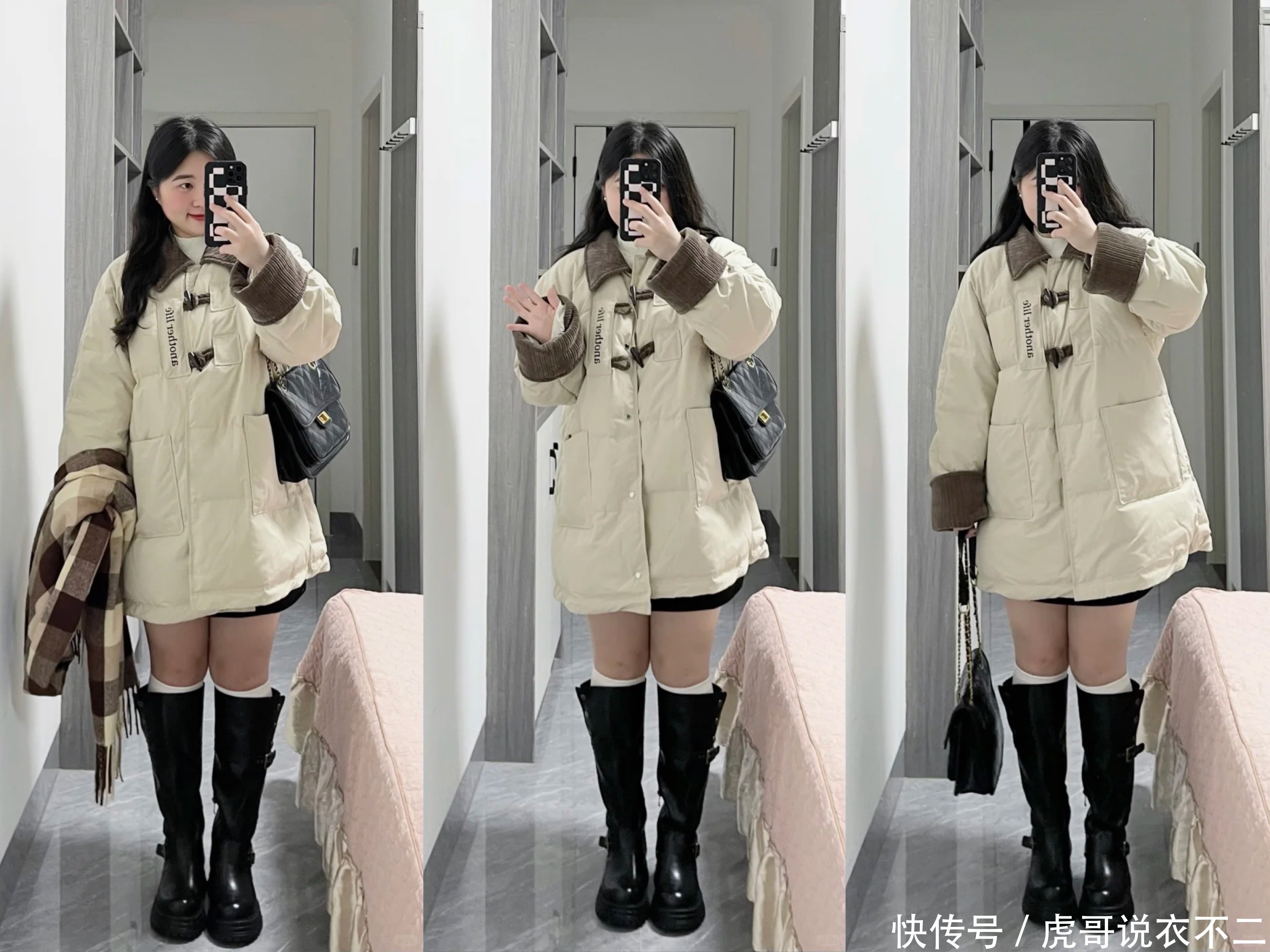 临了即是下衣失散了,中长款外衣+短裤/短裙+长筒靴,这种穿法永不外时,显瘦还显腿长,关于微胖肉体来说黑白常友好且不会出错的搭配。