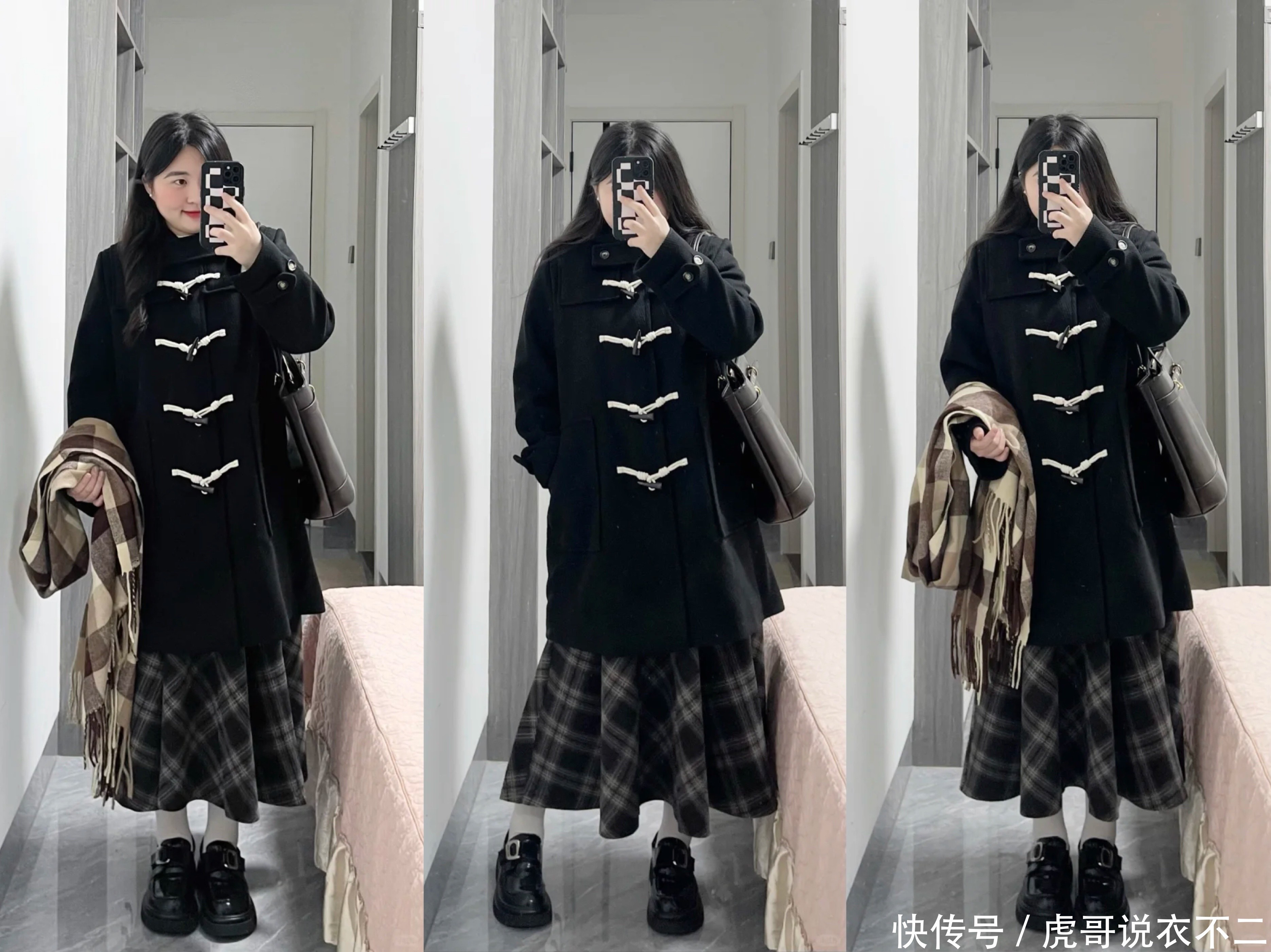 比如玄色中长款牛角扣大衣,搭配格纹百褶半身裙+乐福鞋,大衣略带收腰的版型,再加上百褶裙的裙摆有蓬松成果,固然莫得明确的腰线位置,然则合座造型依然会有一定的弧线感,看起来依然很显瘦的。