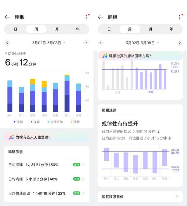 不外呢,在使用中小雷也发现了一些小 bug,举例 3 月 2 日到 3 月 8 日这段时刻,小雷因为出差的原因在欧洲呆了一周,但在入睡时刻纪录上 OPPO Watch X3 却使用的是国内时刻,以至于出现小雷日均早上七点才入睡,下昼少量才起床的奇特情况,但愿 OPPO 的联系团队后续能优化好这一功能。